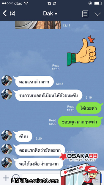 หลังจากใช้งานลูกค้าโทรมาคุยว่า ตอนแรกคิดว่ายาก แต่พอใช้งานจริงใช้งานไม่ยาก สามารถดูแลรถด้วยตัวเอง และประทับใจในผลงาน เหมือนซื้อครั้งเดียวคุ้ม ที่บ้านมีรถหลายคันยิ่งคุ้มค่ะ