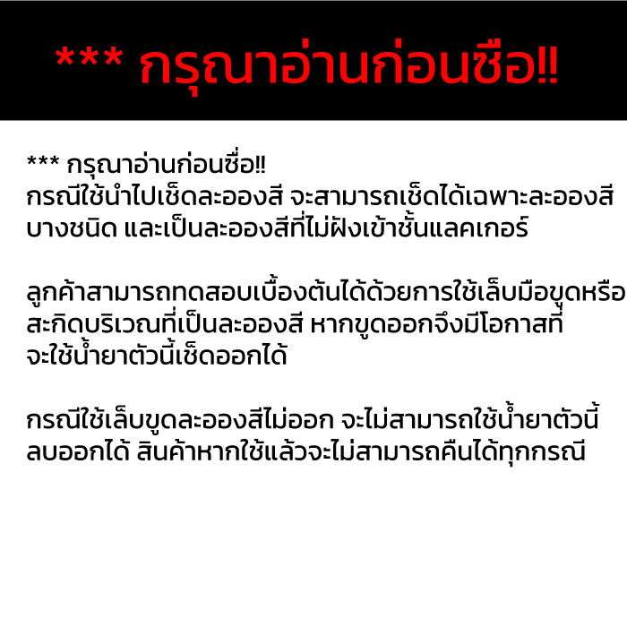 กรณีใช้เล็บขูดละอองสีไม่ออก จะไม่สามารถใช้น้ำยาตัวนี้ลบออกได้ สินค้าหากใช้แล้วจะไม่สามารถคืนได้ทุกกรณี