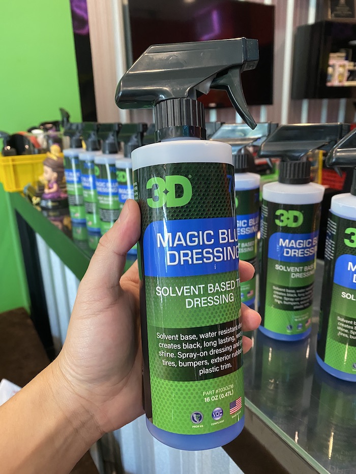 3D Magic Blue Dressing was designed as a “catch-all” dressing to use on pretty much every solid surface of your vehicle. 3D Magic Blue Dressing can be used effectively on any trim, vinyl, molding, bumper, or tires on your vehicle. The high viscosity of 3D Magic Blue Dressing will ensure that it does not run down the surface while you are trying to apply it in the more minute and niche areas of your car. 3D Magic Blue Dressing is water resistant, so it will aid in preventing water spots from forming on your vehicle. The long-lasting glossy finish will have you truly believing just how Magical this product is!