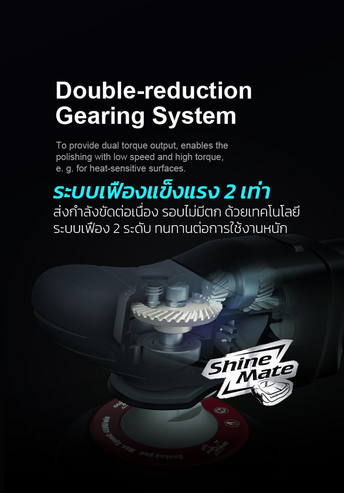 - ระบบเฟืองแบบพิเศษ Double2Torque System เกียร์ 2 ระดับ (เฟือง 4 ตัว) ส่งกำลังขัดต่อเนื่อง กำลังดีไม่มีตก