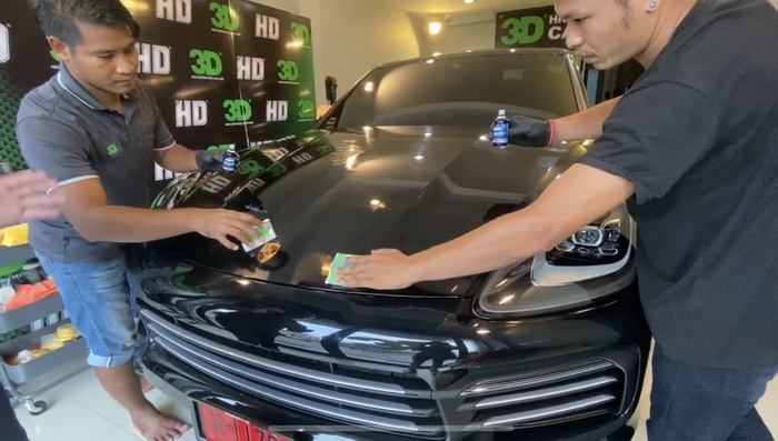 รถ Porsche Cayenne คันนี้เคลือบทั้งหมด 4 รอบ เราสามารถเพิ่มความหนาของชั้นแก้วได้ตามต้องการ ยิ่งเคลือบ ยิ่งเงา ยิ่งหนา ยิ่งปกป้อง