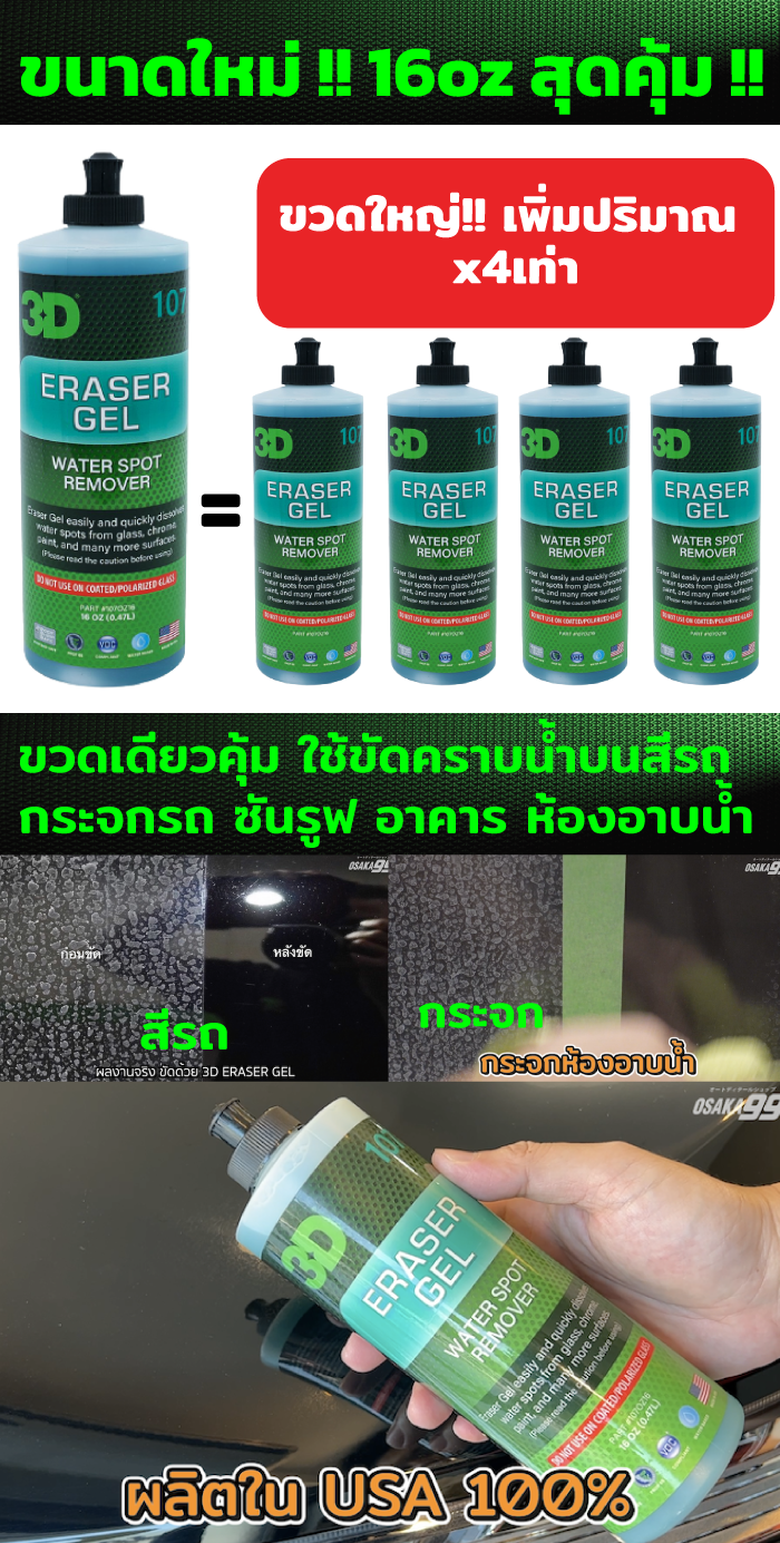 3D Eraser Gel ผลิตและนำเข้าจาก USA ขายดีทั่วโลกด้วยคุณสมบัติเด่น สามารถขัดคราบน้ำฝังแน่น บนสีรถ และกระจกออกได้อย่างง่ายดาย โดยไม่เป็นอันตรายต่อพื้นผิว